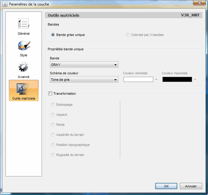 L'onglet Outils matriciels de la fenêtre Paramètres de la couche contient les fonctions illustrées dans la figure suivante :