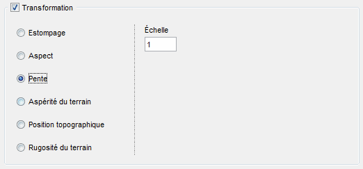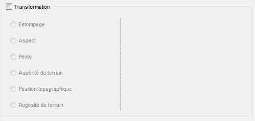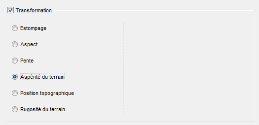 <table data-header-hidden><thead><tr><th width="231.24700239808152"></th><th></th></tr></thead><tbody><tr><td>Aspérité du terrain</td><td>Transformation définie comme étant la différence entre un pixel central et les pixels qui l'entourent.</td></tr><tr><td>Position topographique</td><td>Transformation définie comme étant la différence entre un pixel central et la moyenne des pixels qui l'entourent.</td></tr><tr><td>Rugosité du terrain</td><td>Transformation définie comme étant la plus grande différence entre un pixel central et les pixels qui l'entourent.</td></tr></tbody></table>