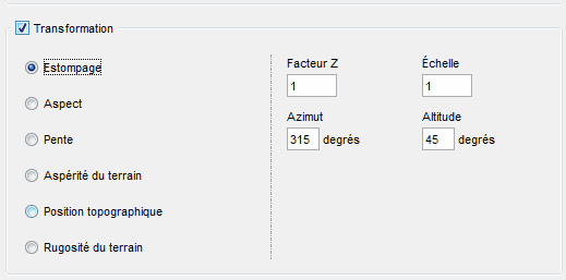 Le paramètre **Transformation** permet d’appliquer des transformations matricielles à notre modèle numérique de terrain afin de le visualiser selon une nouvelle perspective.