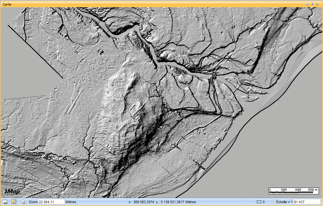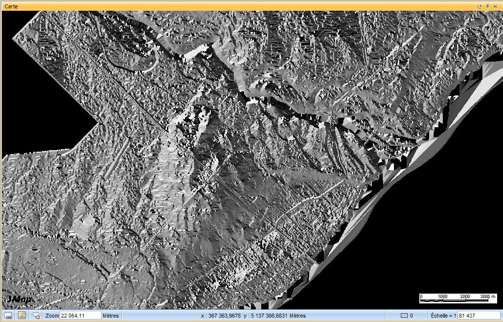 La transformation d'**Estompage** permet la visualisation du relief du terrain selon un effet d'ombrage.