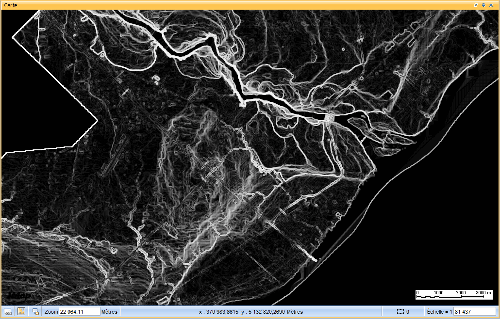 La transformation **Pente** permet la représentation du terrain en fonction de la pente. Plus la pente sera raide, plus le niveaux de gris sera élevé, se rapprochant du blanc.
