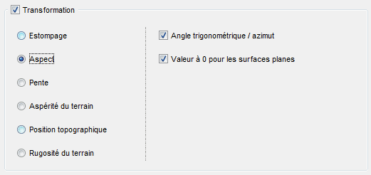 La transformation d'**Aspect** permet de produire une carte représentant l'orientation des faces du terrain en quatre catégories (nord, sud, est, ouest) selon des niveaux de gris différents.