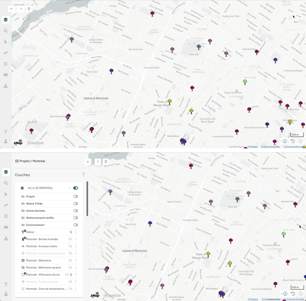 <table data-header-hidden><thead><tr><th width="140.69230769230768" align="center"></th><th></th></tr></thead><tbody><tr><td align="center"><img src="https://3048819513-files.gitbook.io/~/files/v0/b/gitbook-x-prod.appspot.com/o/spaces%2FbUcAjuZV4Pk5ljdFZZn6%2Fuploads%2Fgit-blob-83b7c988155d543e902f95f7425823eb07dcd316%2Fng-arrow_r.png?alt=media" alt="" data-size="line"></td><td>Flèche pour ouvrir un panneau.<br>Chaque panneau présente le nom du projet ouvert.<br>Pour changer de projet cliquez sur <strong>Projets</strong>.<br>L'interface des projets s'affiche et vous pouvez sélectionner un nouveau projet en cliquant dessus.</td></tr><tr><td align="center"><img src="https://3048819513-files.gitbook.io/~/files/v0/b/gitbook-x-prod.appspot.com/o/spaces%2FbUcAjuZV4Pk5ljdFZZn6%2Fuploads%2Fgit-blob-82c7d20d84dce75689a3686681e477a93351b0b5%2Fng-arrow_l.png?alt=media" alt="" data-size="line"></td><td>Flèche pour fermer le panneau.</td></tr><tr><td align="center"><img src="https://3048819513-files.gitbook.io/~/files/v0/b/gitbook-x-prod.appspot.com/o/spaces%2FbUcAjuZV4Pk5ljdFZZn6%2Fuploads%2Fgit-blob-4a089abc0193754c9629687819e1d5308aa62350%2Fng-add-element.png?alt=media" alt="" data-size="line"></td><td>Bouton pour ajouter un élément cartographique à une couche éditable.<br>La section <a href="../je-souhaite.../editer-des-donnees">Éditer des données</a> présente en détail les fonctions offertes.</td></tr><tr><td align="center"><img src="https://3048819513-files.gitbook.io/~/files/v0/b/gitbook-x-prod.appspot.com/o/spaces%2FbUcAjuZV4Pk5ljdFZZn6%2Fuploads%2Fgit-blob-d0415ba3c9dfaa572addf89950ee8894f2fec075%2Fng-search-place.png?alt=media" alt="" data-size="line"></td><td>Rechercher un lieu.<br>La section <a href="naviguer-sur-la-carte">Naviguer sur la carte</a> offre les détails de cette fonction.<br>Cette fonction est seulement disponible lorsqu’il y a une clé d’API Mapbox configurée dans JMap Admin. Contactez votre administrateur JMap pour avoir plus de détails.</td></tr><tr><td align="center"><img src="https://3048819513-files.gitbook.io/~/files/v0/b/gitbook-x-prod.appspot.com/o/spaces%2FbUcAjuZV4Pk5ljdFZZn6%2Fuploads%2Fgit-blob-422518f6ff8b508d4581e3aa3abf01becd2fe5da%2Fng-layer.png?alt=media" alt="" data-size="line"></td><td>Cliquez sur cette icône pour afficher le panneau <strong>Couches</strong>.<br>La section <a href="../les-donnees">Les données</a> présente en détail les fonctions offertes.</td></tr><tr><td align="center"><img src="https://3048819513-files.gitbook.io/~/files/v0/b/gitbook-x-prod.appspot.com/o/spaces%2FbUcAjuZV4Pk5ljdFZZn6%2Fuploads%2Fgit-blob-649430457b608dd6b80e14c8aa85bccfc1d8d1a1%2Fng-search.png?alt=media" alt="" data-size="line"></td><td>Cliquez sur cette icône pour afficher le panneau <strong>Rechercher sur la carte</strong>.<br>La section <a href="../je-souhaite.../effectuer-des-recherches">Effectuer des recherches</a> présente en détail ces fonctions.</td></tr><tr><td align="center"><img src="https://3048819513-files.gitbook.io/~/files/v0/b/gitbook-x-prod.appspot.com/o/spaces%2FbUcAjuZV4Pk5ljdFZZn6%2Fuploads%2Fgit-blob-3cd5844a3ecfe2a5cddd81dade6d559cf04cb1f5%2Fng-select.png?alt=media" alt="" data-size="line"></td><td>Cliquez sur cette icône pour afficher le panneau <strong>Sélection</strong>.<br>La section <a href="../je-souhaite.../selectionner-des-elements-dans-la-carte">Sélectionner des éléments dans la carte</a> présente en détail ces fonctions.</td></tr><tr><td align="center"><img src="https://3048819513-files.gitbook.io/~/files/v0/b/gitbook-x-prod.appspot.com/o/spaces%2FbUcAjuZV4Pk5ljdFZZn6%2Fuploads%2Fgit-blob-19fc84869e46ae5b02cb1367d776288925e45260%2Fng-mesure.png?alt=media" alt="" data-size="line"></td><td>Cliquez sur cette icône pour afficher le panneau <strong>Mesure</strong>.<br>La section <a href="../je-souhaite.../mesurer-des-distances-et-des-superficies">Mesurer des distances et des superficies</a> présente en détail ces fonctions.</td></tr><tr><td align="center"><img src="https://3048819513-files.gitbook.io/~/files/v0/b/gitbook-x-prod.appspot.com/o/spaces%2FbUcAjuZV4Pk5ljdFZZn6%2Fuploads%2Fgit-blob-8ce7f550f0a3ee66d386bbf3fc7ea516d5b2a6fd%2Fng-annotation.png?alt=media" alt="" data-size="line"></td><td>Cliquez sur cette icône pour afficher le panneau <strong>Annotations</strong>.<br>La section <a href="../je-souhaite.../effectuer-des-annotations-sur-la-carte">Effectuer des annotations</a> présente en détail les fonctions offertes.</td></tr><tr><td align="center"><img src="https://3048819513-files.gitbook.io/~/files/v0/b/gitbook-x-prod.appspot.com/o/spaces%2FbUcAjuZV4Pk5ljdFZZn6%2Fuploads%2Fgit-blob-ad349cd8ab1f4d0ef8d57ec0d8a33ac82f2407a7%2Fng-context.png?alt=media" alt="" data-size="line"></td><td>Cliquez sur cette icône pour afficher le panneau <strong>Mes cartes</strong>.<br>La section <a href="../je-souhaite.../creer-et-gerer-des-cartes-personnalisees">Créer et gérer des cartes personnalisées</a> présente en détail les fonctions offertes.</td></tr><tr><td align="center"><img src="https://3048819513-files.gitbook.io/~/files/v0/b/gitbook-x-prod.appspot.com/o/spaces%2FbUcAjuZV4Pk5ljdFZZn6%2Fuploads%2Fgit-blob-2f1a3b5def8457e35d78b8fd30df93f2e96418a9%2Fng-print.png?alt=media" alt="" data-size="line"></td><td>Cliquez sur cette icône pour afficher le panneau <strong>Exportation /</strong> <strong>Impression</strong>.<br>La section <a href="../je-souhaite.../exporter-imprimer-une-carte">Exporter / imprimer une carte</a> présente en détail les fonctions offertes.</td></tr><tr><td align="center"><img src="https://3048819513-files.gitbook.io/~/files/v0/b/gitbook-x-prod.appspot.com/o/spaces%2FbUcAjuZV4Pk5ljdFZZn6%2Fuploads%2Fgit-blob-bdca3821c459ac77b2892caddb0f5217ce8b9c2c%2Fng-help.png?alt=media" alt="" data-size="line"></td><td>Cliquez sur cette icône pour accéder aux guides de l'utilisateur et du développeur de JMap NG.</td></tr><tr><td align="center"><img src="https://3048819513-files.gitbook.io/~/files/