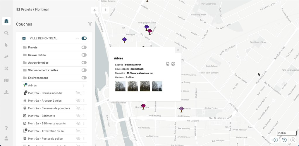 Les infobulles donnent aussi accès aux outils pour éditer les éléments (si la couche est éditable et vous avez les permis d’édition pertinents) et aux rapports d’information (si la couche a des rapports d’information configurés).