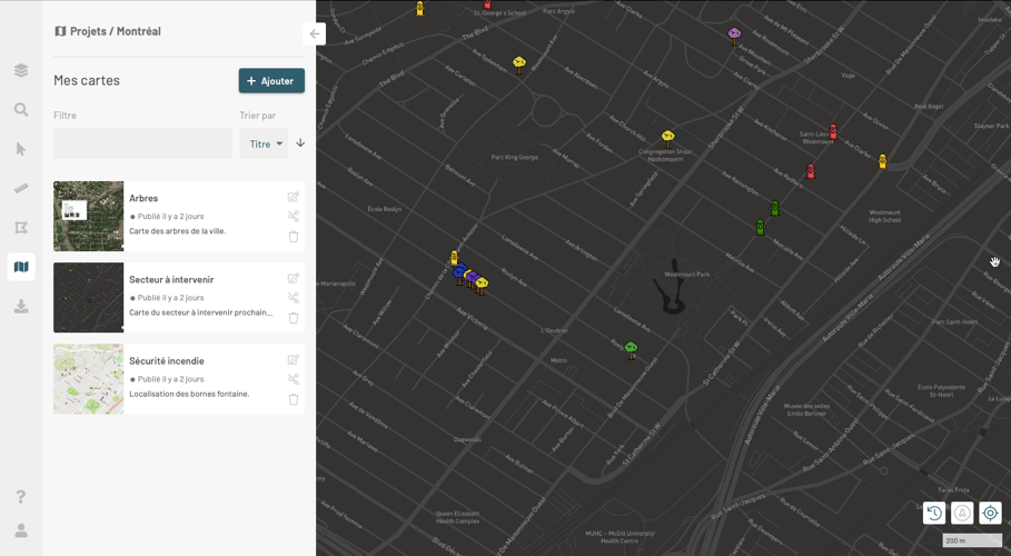 Le panneau **Mes cartes** contient la liste des cartes personnalisées, les outils pour en créer des nouvelles et les partager.