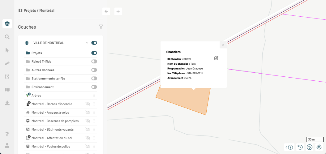 1. Cliquez sur l'élément que vous souhaitez modifier pour afficher son infobulle. Si la couche est éditable et vous avez les permissions nécessaires, l'icône <img src="https://3048819513-files.gitbook.io/~/files/v0/b/gitbook-x-prod.appspot.com/o/spaces%2FbUcAjuZV4Pk5ljdFZZn6%2Fuploads%2Fgit-blob-e3616e3871e36ef986dcb11bbef2d125a9626b35%2Fng-edit.png?alt=media" alt="" data-size="line"> s'affiche dans l'infobulle.