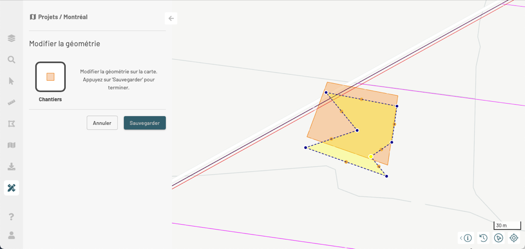 2. Cliquez sur <img src="https://3048819513-files.gitbook.io/~/files/v0/b/gitbook-x-prod.appspot.com/o/spaces%2FbUcAjuZV4Pk5ljdFZZn6%2Fuploads%2Fgit-blob-e3616e3871e36ef986dcb11bbef2d125a9626b35%2Fng-edit.png?alt=media" alt="" data-size="line"> pour éditer l'élément. Une fenêtre s'affiche indiquant les modifications disponibles en fonction de vos permissions : **Modifier la géométrie**, **Modifier les informations** ou **Supprimer**.