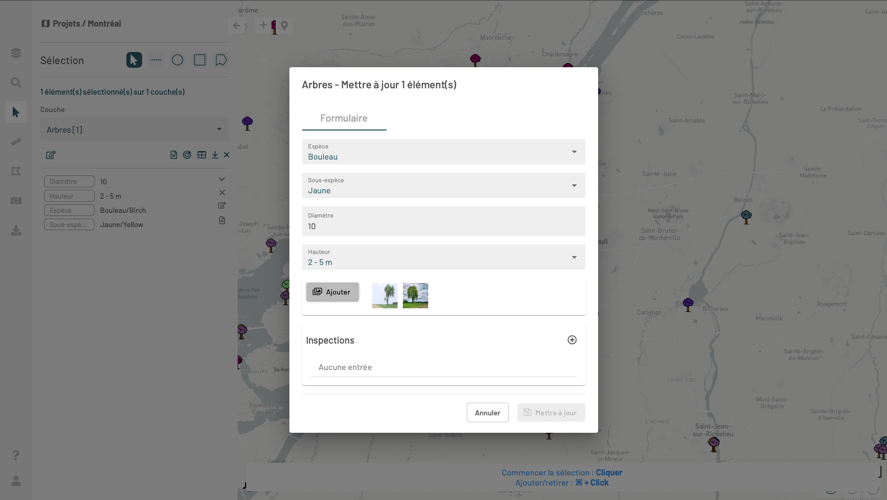 Certains formulaires contiennent des sous-formulaires pour consigner des informations en lien à l'élément, par exemple des inspections au cours du temps des arbres ou des infrastructures. Les sous-formulaires sont une section distincte dans le formulaire.