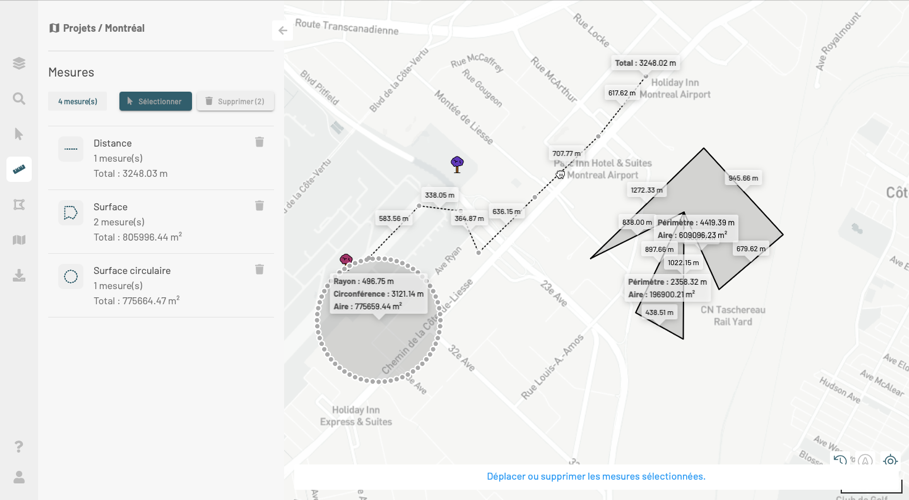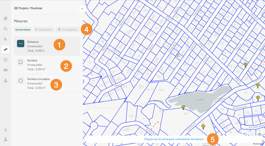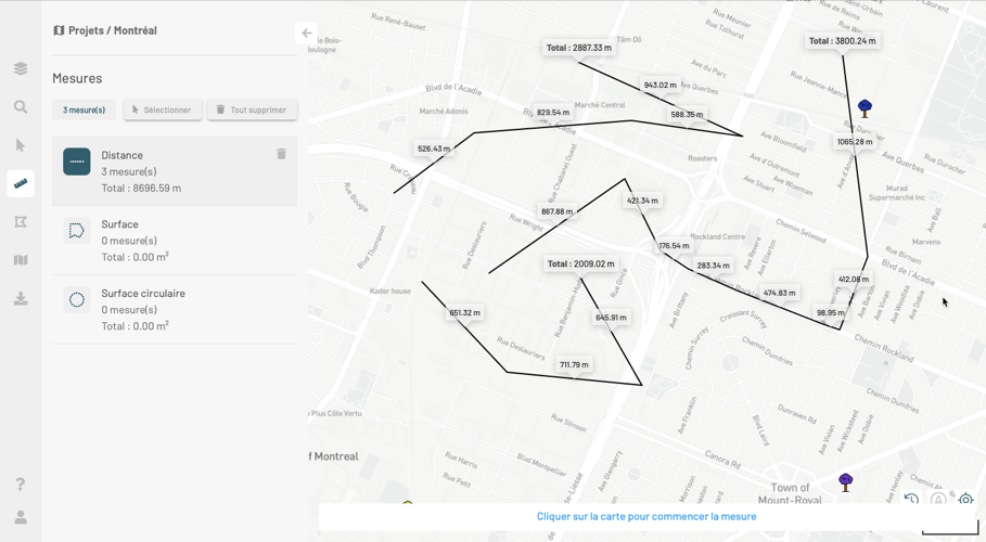 3. Effectuez les mesures. Vous pouvez utiliser les différentes outils, les mesures s'accumulent sur la carte et la distance et/ou superficies mesurées s'affichent dans la fiche de l'outil correspondant. Le nombre total de mesures effectuées s'affiche dans le panneau.