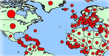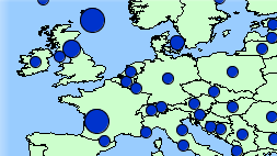 Les thématiques de type symboles gradués affichent des symboles circulaires superposés aux éléments cartographiques qu'ils qualifient. La taille des symboles est graduée selon un nombre fini de classes basées sur un attribut numérique.
