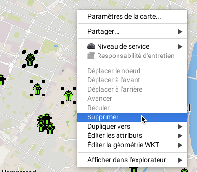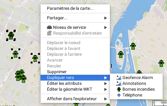Le menu contextuel offre d'autres outils d'édition pour des éléments individuels ou pour une sélection d'éléments que vous avez fait au moyen des outils de sélection : vous pouvez supprimer les éléments ou vous pouvez les dupliquer vers d'autres couches éditables.