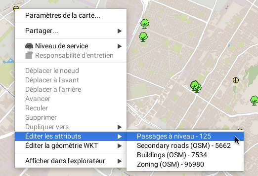 Pour modifier les **attributs** d'un élément vous devez cliquer sur l'élément dans la carte avec le bouton droit afin d'afficher le **menu contextuel**. Sélectionnez la fonction **Éditer les attributs** et sélectionnez l'élément que vous désirez éditer. Notez que tous les éléments des couches éditables qui se trouvent à la place où vous avez cliqué s'affichent.