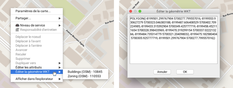 Le menu contextuel vous permet aussi d'éditer des éléments en format WKT. La fonction **Éditer la géométrie WKT** affiche les éléments des couches qui se trouvent dans le point de la carte dans lequel le menu contextuel est ouvert. Sélectionnez un des éléments pour ouvrir la fenêtre qui contient les coordonnées et les données de l'élément. Si vous avez les permissions, vous pouvez éditer ces données.
