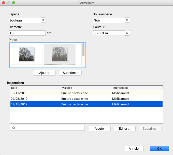 Les formulaires des attributs peuvent contenir aussi des sous-formulaires imbriqués, par exemple pour saisir des informations sur des inspections d'un élément au cours du temps, comme la figure de l'exemple suivant.