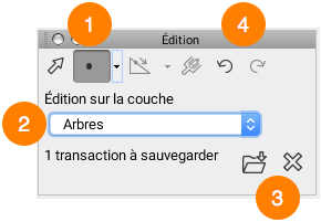 <table data-header-hidden><thead><tr><th width="73.7910447761194"></th><th></th></tr></thead><tbody><tr><td><strong>1</strong></td><td>Sélectionnez le type de géométrie à créer.<br>Vous ne pouvez pas sélectionner un type qui soit incompatible avec le type de la couche (p.e. il n'est pas possible de créer des polygones sur une couche de points).</td></tr><tr><td><strong>2</strong></td><td>Sélectionnez la couche sur laquelle vous souhaitez créer des éléments.<br>Si plusieurs couches éditables existent dans le projet (incluant les couches personnelles), elles seront toutes présentées dans cette liste.<br><strong>Note</strong> : La couche nommée <strong>Annotations</strong> n'est pas une couche personnelle. Il s'agit d'une couche générique sur laquelle vous pouvez dessiner librement mais sans possibilité de définir des attributs.</td></tr><tr><td><strong>3</strong></td><td>Lors que vous faites des modifications (ajouts, modifications, suppressions) sur une couche personnelle, JMap stocke des transactions que vous devez sauvegarder. Appuyez sur <img src="https://3048819513-files.gitbook.io/~/files/v0/b/gitbook-x-prod.appspot.com/o/spaces%2FbUcAjuZV4Pk5ljdFZZn6%2Fuploads%2Fgit-blob-8384a24acffa66ab74f2f08791b6fcc72f5de0af%2Fsave_editions.png?alt=media" alt="" data-size="original"> pour sauvegarder les transactions sur la couche au serveur JMap.<br>Appuyez sur <img src="https://3048819513-files.gitbook.io/~/files/v0/b/gitbook-x-prod.appspot.com/o/spaces%2FbUcAjuZV4Pk5ljdFZZn6%2Fuploads%2Fgit-blob-3cd116d02dbb6ca92f158013aedf1651a9ca1d79%2Fdiscard_drawings.png?alt=media" alt="" data-size="original"> pour rejeter les transactions et annuler toutes les modifications sur la couche.</td></tr><tr><td><strong>4</strong></td><td>Toutes les opérations d'éditions peuvent être annulées une à une si elles ne sont pas sauvegardées.<br>Vous pouvez aussi rétablir des opérations annulées en appuyant sur la flèche de droite.</td></tr></tbody></table>