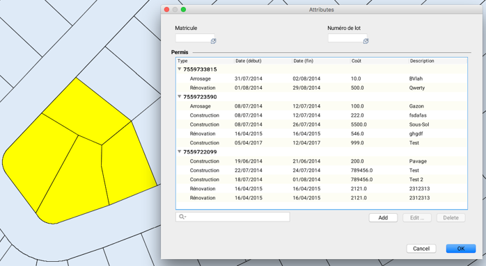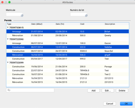 Vous pouvez aussi éditer en lot les attributs d'une sélection d'éléments de certaines couches. En effet, lorsque une couche contient des formulaires avec des sous-formulaires vous pouvez faire l'édition des attributs d'un formulaire ou d'un sous-formulaire en lot, pour l'ensemble d'éléments que vous avez sélectionné. Dans le cas des sous-formulaires, l'édition comprend l'ajout de nouveaux enregistrements ainsi que la modification ou la suppression d'enregistrements existants.