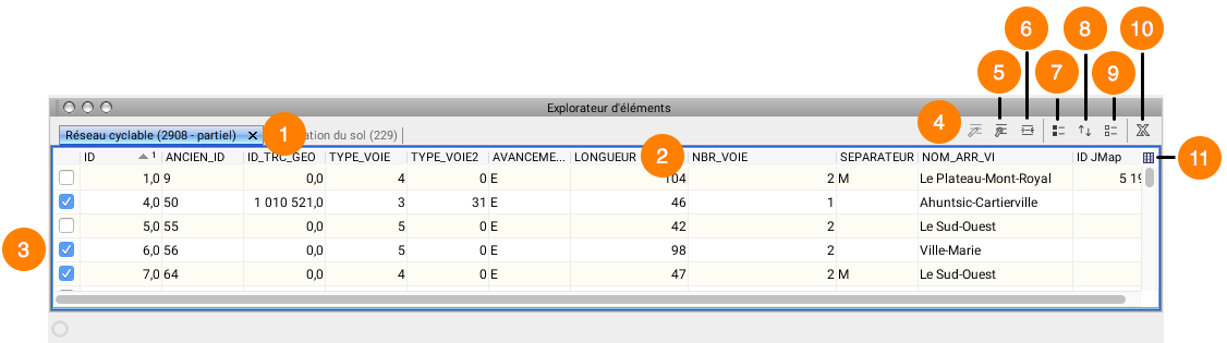 <table data-header-hidden><thead><tr><th width="92.01465201465203"></th><th></th></tr></thead><tbody><tr><td><strong>1</strong></td><td>Chaque onglet est associé à une couche.<br>Le nom de la couche est indiqué, ainsi que le nombre d'éléments qui sont chargés. Le nombre d'éléments chargés sur une couche peut être inférieur au nombre total d'éléments que la couche contient. Dans un tel cas, l'indication spéciale <em>partiel</em> est ajoutée dans le titre de l'onglet.</td></tr><tr><td><strong>2</strong></td><td>Chaque attribut de la couche est représenté par une colonne de la table. L'entête de la colonne indique le titre de l'attribut.<br>Vous pouvez trier la table par les valeurs d'un attribut en cliquant sur l'entête de la colonne correspondante.<br>Vous pouvez aussi trier la table par plusieurs attributs en maintenant enfoncée la touche CTRL et en cliquant sur plusieurs entêtes.<br>Enfin, les colonnes peuvent être déplacées en saisissant une colonne par son entête et en la glissant horizontalement.</td></tr><tr><td><strong>3</strong></td><td>Les cases à cocher de la première colonne servent à sélectionner des éléments.<br>Tous les éléments sélectionnés dans la table apparaîtront sélectionnés sur la carte.<br>À l'inverse, tous les éléments sélectionnés avec les outils de sélection sur la carte seront sélectionnés dans la table.</td></tr><tr><td><strong>4</strong></td><td>Appuyez sur ce bouton pour activer le mode d'édition.<br>Le mode d'édition permet de modifier les valeurs des attributs ainsi que d'effacer l'élément.<br>Cette fonction n'est disponible qu'avec les couches éditables incluant les <a href="couches-editables/couches-personnelles">couches personnelles</a>.</td></tr><tr><td><strong>5</strong></td><td>Appuyez sur ce bouton pour activer la fonction zoom automatique.<br>Si cette fonction est activée, la sélection de rangées dans la table causera un zoom sur les éléments correspondants sur la carte.</td></tr><tr><td><strong>6</strong></td><td>Appuyez sur ce bouton pour activer la fonction surbrillance automatique.<br>Si cette fonction est activée, la sélection de rangées dans la table fera clignoter les éléments correspondants sur la carte.</td></tr><tr><td><strong>7</strong></td><td>Appuyez sur ce bouton pour sélectionner tous les éléments de la couche.</td></tr><tr><td><strong>8</strong></td><td>Appuyez sur ce bouton pour inverser la sélection sur la couche.<br>Tous les éléments sélectionnés deviendront non sélectionnés et vice versa.</td></tr><tr><td><strong>9</strong></td><td>Appuyez sur ce bouton pour désélectionner tous les éléments de la couche.</td></tr><tr><td><strong>10</strong></td><td>Ce bouton permet d'ouvrir la tables des attributs dans un tableur comme Excel ou exporter la table dans un fichier en format CSV.</td></tr><tr><td><strong>11</strong></td><td><p>Ce bouton permet de sélectionner les attributs à afficher dans l'explorateur.</p><p><img src="https://3048819513-files.gitbook.io/~/files/v0/b/gitbook-x-prod.appspot.com/o/spaces%2FbUcAjuZV4Pk5ljdFZZn6%2Fuploads%2Fgit-blob-76aa5799fa711ff3a843476048e81a62471cc258%2Fclip0013.png?alt=media" alt="" data-size="original"></p></td></tr></tbody></table>