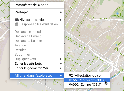 Il est aussi possible d'ouvrir l'explorateur d'éléments en faisant un **clic droit sur un élément de la carte** et en sélectionnant l'item **Afficher dans l'explorateur**. L'explorateur d'éléments s'ouvrira et sélectionnera la rangée d'attributs correspondant à l'élément. À l'inverse, un double-clic sur une rangée de la table causera un zoom sur l'élément correspondant sur la carte et celui-ci clignotera brièvement.