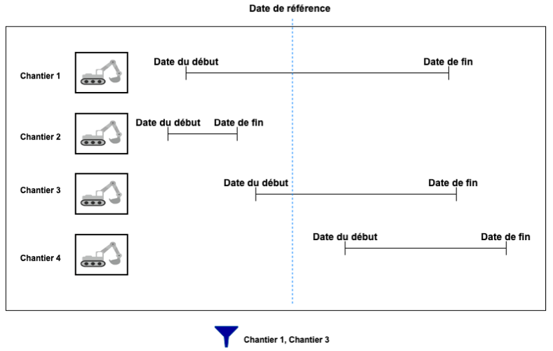Intervalle : Ce type d'opérateur permet de filtrer les données d'une couche sur la base d'intervalles de temps définis à partir d'une date de début, d'une date de fin et d'une date de référence. L'utilisateur dispose ainsi d'un outil pour afficher des données qui varient dans le temps.