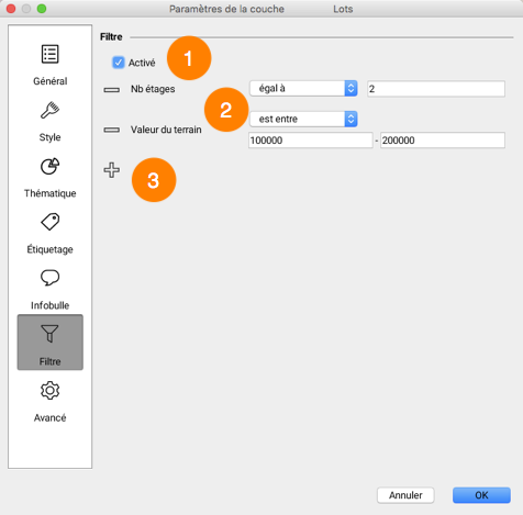 Cette section permet de définir les paramètres du filtre qui peut être appliquée aux couches vectorielles. Vous pouvez filtrer les éléments d'une couche en configurant un filtre. Les éléments qui ne correspondent pas aux critères du filtre ne s'affichent pas.
