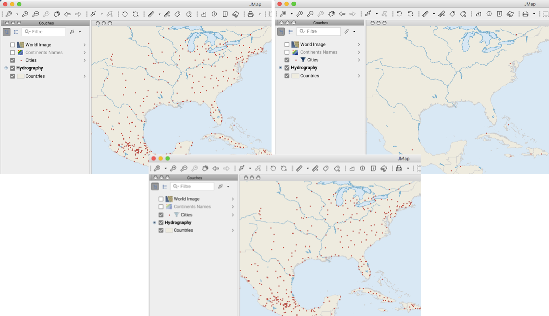 adjacent au nom de la couche indique qu'un filtre est activé. Le filtre peut être désactivé en décochant la case correspondante. Dans ce cas là tous les éléments de la couche s'affichent et l'icône