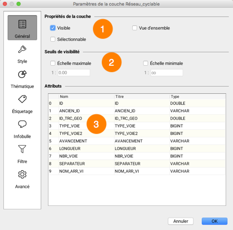 <table data-header-hidden><thead><tr><th width="74.97101449275362"></th><th></th></tr></thead><tbody><tr><td><strong>1</strong></td><td><p><strong>Visible</strong> : Rendre la couche visible ou invisible. Seules les couches visibles sont affichées sur la carte.</p><p><strong>Sélectionnable</strong> : Rendre les éléments de la couche sélectionnables. Si cette option n'est pas sélectionnée, les éléments de la couches ne peuvent pas être sélectionnés avec les outils de sélection.</p><p><strong>Vue d'ensemble</strong> : Ajouter cette couche dans la vue d'ensemble de l'application. La vue d'ensemble peut être activée par le menu <strong>Afficher->Vue d'ensemble</strong> ou par le raccourci <strong>CTRL-O</strong>.</p></td></tr><tr><td><strong>2</strong></td><td><p>Les seuils de visibilité permettent de définir les échelles entre lesquelles la couche est affichée sur la carte.</p><p>Si l'échelle de la carte affichée n'est pas comprise entre les échelles minimales et maximales, la couche ne s'affiche pas.</p><p>Si les options ne sont pas sélectionnées, les seuils sont ignorés.</p><p>Une couche grisée dans le gestionnaire de couches indique que la couche n'est pas affichée à cause des seuils de visibilité.</p><p>Il est possible que ces options ne puissent pas être modifiées, selon ce qui a été décidé par l'administrateur de JMap.</p><p><img src="https://3048819513-files.gitbook.io/~/files/v0/b/gitbook-x-prod.appspot.com/o/spaces%2FbUcAjuZV4Pk5ljdFZZn6%2Fuploads%2Fgit-blob-34fede621106a2296346799e2b207a83ac6bcf8e%2Fseuils.png?alt=media" alt="" data-size="original"></p></td></tr><tr><td><strong>3</strong></td><td>Les attributs liés aux éléments de la couche sont présentés dans cette table.<br>Le titre et le type des attributs sont indiqués.<br>Les attributs de la couche sont des données descriptives associées aux éléments de la couche. Ils sont utilisés dans les infobulles, comme étiquettes, pour les cartes thématiques, etc.</td></tr></tbody></table>