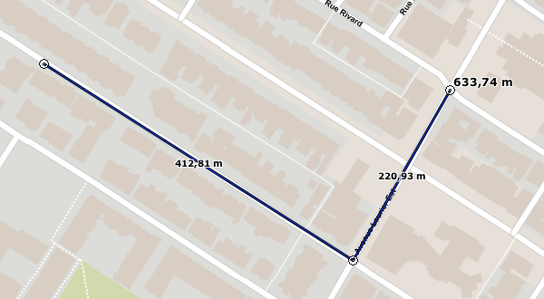 L'outil de mesure de distance permet de mesurer des distances à vol d'oiseau entre 2 points. L'outil permet de faire des mesures à plusieurs segments et d'obtenir la distance pour chaque segment ainsi que la distance totale des segments cumulés.