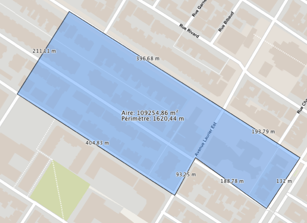 L'outil de mesure de superficie permet de mesurer des aires et périmètres en dessinant un polygone sur la carte. Les mesures sont persistantes, c'est-à-dire qu'elles demeurent sur la carte jusqu'à ce que l'utilisateur les efface.