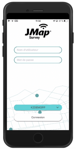5. Touchez **Connexion**. L'interface graphique affiche la carte centrée dans la localisation de votre dispositif. La section [Interface graphique](https://docs.k2geospatial.com/fr2/utilisateur-dapplications/guide-dutilisation-de-jmap-survey/introduction/interface-graphique) offre les détails pour personnaliser la carte affichée.