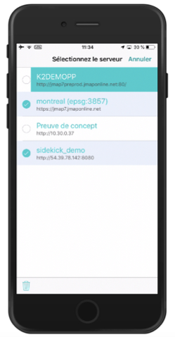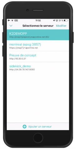 Dans l'écran d'accueil de JMap Survey, vous pouvez vous connecter à d'autres projets à partir de l'écran **Sélectionnez le serveur** :